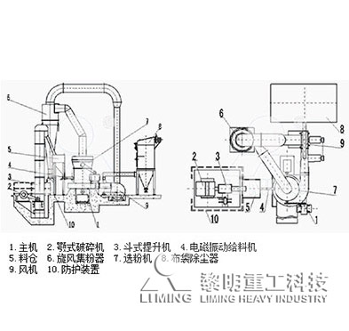 當(dāng)主機(jī)電機(jī)通過傳動(dòng)裝置帶動(dòng)主軸轉(zhuǎn)動(dòng)時(shí),裝在鏟刀架上的鏟刀與磨輥同步旋轉(zhuǎn),磨輥在磨環(huán)內(nèi)圓滾動(dòng)的同時(shí)繞自身軸自轉(zhuǎn)。電動(dòng)機(jī)通過傳動(dòng)裝置帶動(dòng)分析機(jī)旋轉(zhuǎn),葉輪轉(zhuǎn)速越高,分選出的粉子越細(xì)。為保障磨機(jī)在負(fù)壓狀態(tài)下工作,增加的氣流量通過風(fēng)機(jī)與主機(jī)間的余氣管排入布袋除塵器,被凈化后排入大氣。